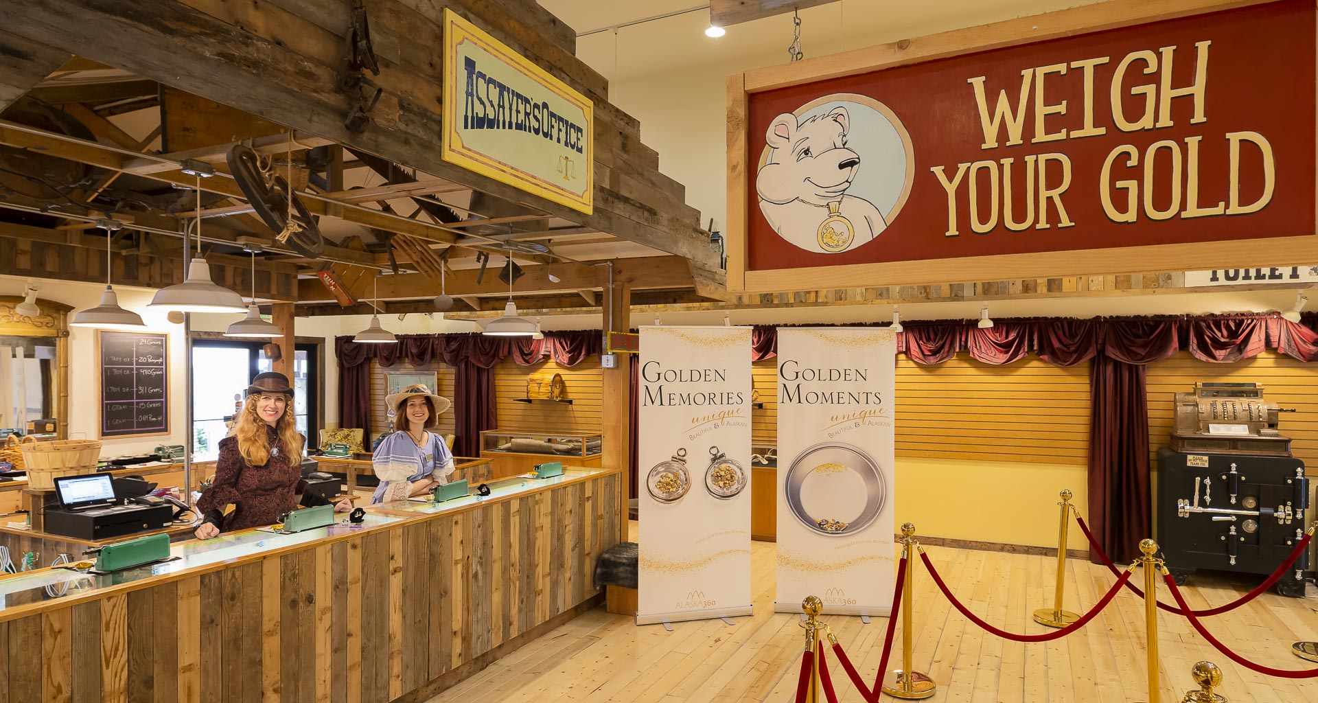 ショッピングを楽しみたいのなら、金のかたまりの最大のコレクション、アラスカ製ジュエリーをお勧めします。また、ギフトショップには採鉱に関するお土産や工具の素晴らしいコレクション、絵本、ツアーのアイテム、子供へのぬいぐるみがいっぱいの犬小屋、犬が食べるお土産などを取り揃えております。